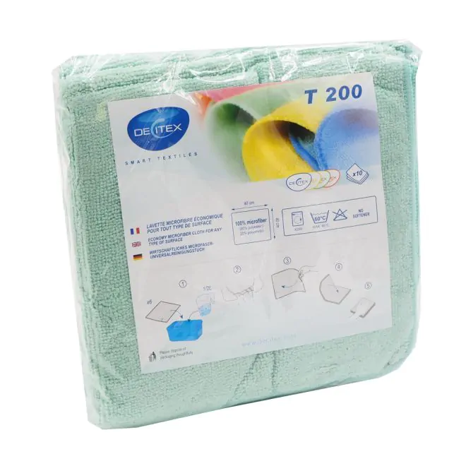 Tant par sa longévité d utilisation que par sa taille (40 x 40 cm), la T200, micro bre de surface basique, est un véritable tout terrain.Pas peurd être perdue, jetée ou déchirée, son prix le lui permet.Ce 4x4 de la propreté brille par son rapport taille / e᷿icacité / prix.Une promenade printanière aux couleurs pastel...L atation par zone de travail (bleu sur le mobilier, rouge dans les sanitaires, etc.) est de mise pour éviter les contaminations croisées et maîtriser l hygiène.Si le pliage en quatre reste un obstacle infranchissable pour vous, mettez n à l utilisation en boule en choisissant sa petite soeur, la Mini 200, qui résout le problème par un pliage en deux naturel et une utilisation à plat.Vous proǯiterez alors pleinement des propriétés de la T200 à un prix Mini.Cartons de 25 sachets de 10 lavettes.