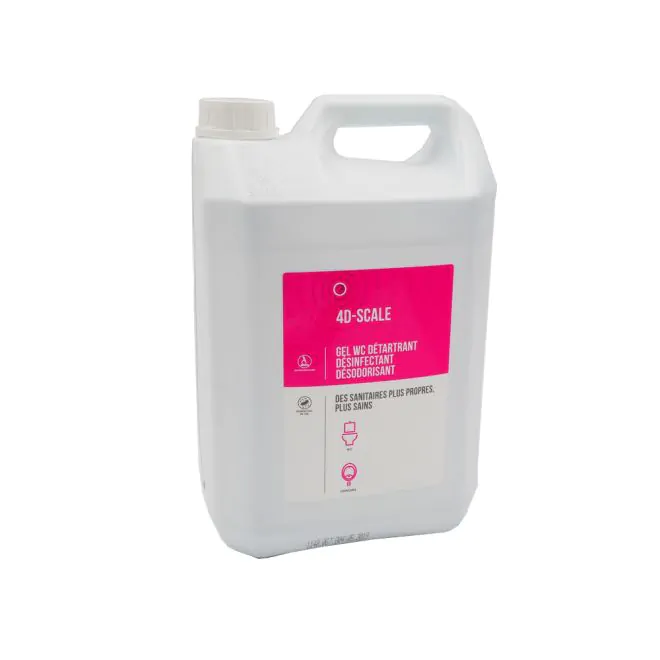 - 4D-SCALE nettoie, détartre, désinfecte et désodorise efficacement tous les WC et urinoirs.- Formulé avec des biosurfactants ultra puissants selon le procédé BIOSURF®, associés au pouvoir détartrant d un complexe d acide lactique d origine naturelle et d acide malique, - 4D-SCALE permet d éliminerles dépôts de tartre et autres résidus organiques, même les plus incrustés.Il redonne aux installations leur éclat naturel et laisse une agréable odeur de propreté.- Sa formule écologique respecte le bon fonctionnement des fosses septiques.- Le bec verseur incliné de 4D-SCALE et sa formule gélifiée parfaitement adaptée pour une action prolongée, en font un allié idéal pour le nettoyage quotidien des sanitaires, jusque dans les zones les plus difficiles d accès.- Pour des sanitaires plus sains, 4D-SCALE est bactéricide selon la norme EN 1040.- Avec une utilisation régulière, l impact environnemental du nettoyage est grandement réduit