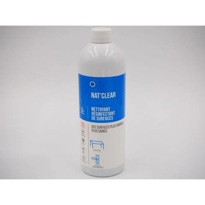 Nettoyant désinfectant de surfaces ECOCERT.NAT CLEAR nettoie et désinfecte efficacement toutes les surfaces lavables.Il permet une faible consommation de produit tout en garantissant une excellente efficacité sur tous les supports.
