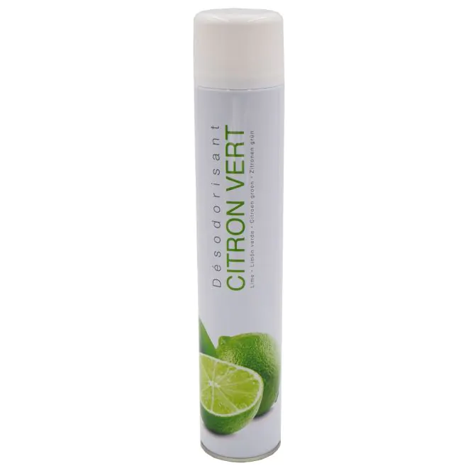 - Désodorisant d atmosphère, sec (sans retombées).- Parfum citron vert.- Neutralise toutes les odeurs de cuisine, de peinture, de tabac, etc., - En procurant une sensation de confort et de fraîcheur.- Il s utilise partout : sanitaires, toilettes, salles de bains, salles de restaurant, hôtels, bureaux, salles d attente, écoles, cliniques, hôpitaux, etc.
