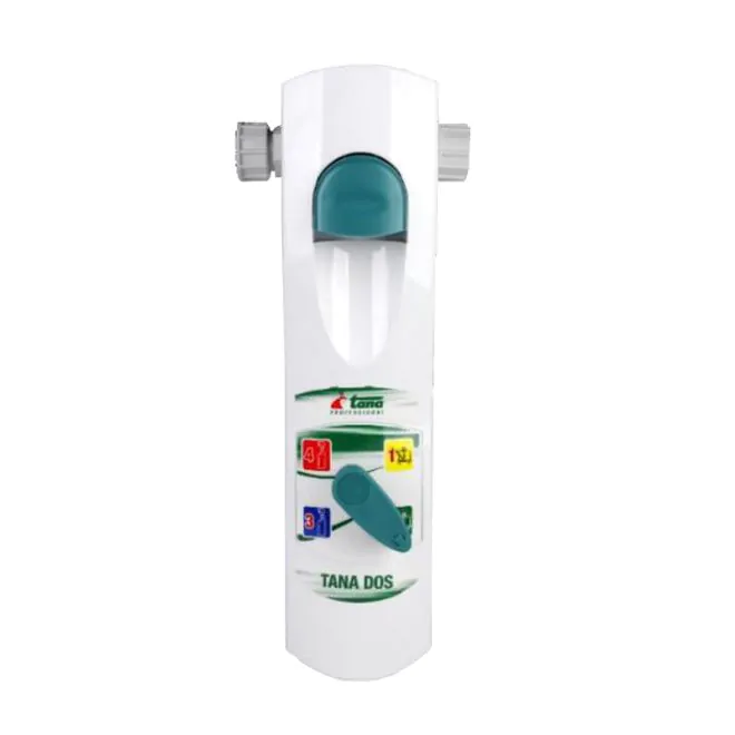 - Simplement raccordé à une arrivée d eau froide, leTana Dos dilue automatiquement,et sans autre manipulation quel appui sur la touche, jusqu à 4 détergents concentrésTana Professional.- La concentration du mélange est définie au moyen de buses de couleur interchangeables.- LeTana Dos doit être fixé sur un mur, plusieurs Tana Dos (toustypes) peuvent être accolés.- Les bidons de produits peuvent être installés dans des supports optionnels: - Porte bidon ouvert pour 1 bidon de 5 litres - Porte bidon fermé à clef pour 1 bidon de 5 litres (Tana Box) - Porte bidon ouvert double pour 2 bidons de 5 litres - Porte bidon ouvert pour 1 bidon de 10 litres
